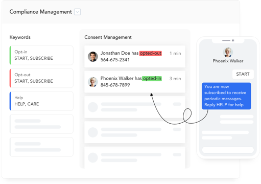 Obtain, renew, and remove customer consent through opt-in and opt-out keywords with an audit trail for text, WhatsApp, Facebook and more. Use registered WhatsApp templates beyond the 24-hour session.